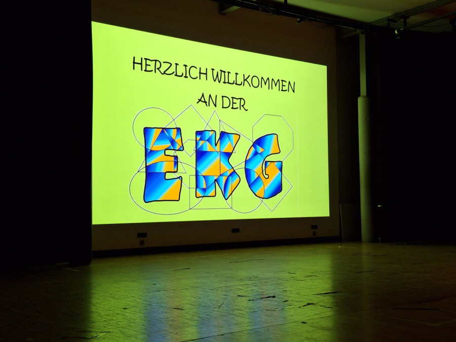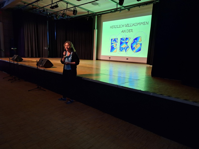 Sechs Wochen Sommerferien sind vergangen und es steht der zweite Schultag des neuen Schuljahres vor der Tür, der zugleich die Einschulung der neuen fünften Klassen darstellt. Die Begrüßungsfeier beginnt mit dem traditionellen Auftritt der Poi-Gruppe „School of fire“. Anschließend begrüßen Dennis Krause, Schulleiter der EKG, und Julia Becker, Abteilungsleiterin der Jahrgänge fünf bis sieben, die neuen Fünftklässler:innen. Daran knüpft ein weiterer Auftritt der Poi-Gruppe an. Die Zuschauer:innen sind begeistert. Nun sind zwei der jetzigen sechsten Klassen an der Reihe, um ihr Können zu präsentieren. Zunächst beginnen sechs Schüler:innen der 6d mit einer beeindruckenden Akrobatik-Show. Hieran schließt sich die 6e mit einem Klopf- und Sprechgesang an, um die neuen Fünftklässler:innen alles Gute für ihren weiteren schulischen Lebensweg zu wünschen. Die Begrüßungsfeier wird durch den Auftritt des Unicef-Chores abgerundet, der das selbst geschriebene und komponierte Unicef-Lied singt. Die Musiklehrer:innen Heike Festerling und Marcus Linnemann begleiten das Stück.
