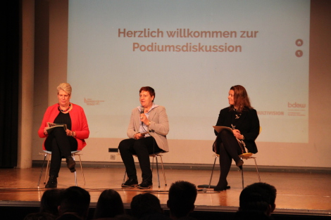 Bünde. Am 8. und 9. November war der Umweltbildungsprojekttag „Unsere Energiewende in NRW!“ zu Gast in Bünde. Dank der Unterstützung durch die Landesgruppe NRW des Bundesverbands der Energie und Wasserwirtschaft e.V. (BDEW) und durch die Energie- und Wasserversorgung Bünde GmbH (EWB) haben die Schülerinnen und Schüler des 9. Jahrgangs und der Q2 der Erich Kästner-Gesamtschule Bünde an der Veranstaltung teilgenommen. An der abschließenden Diskussion nahmen am ersten Projekttag neben der Bürgermeisterin Susanne Rutenkröger auch EWB-Geschäftsführerin Dr. Marion Kapsa und Manuela Handke, Vorständin der Kommunalbetriebe Bünde AöR teil. Am 9.11. haben Andrea Brückner (Technische Beigeordnete der Stadt Bünde) sowie Volker Beinke (Geschäftsführer der Stadtverkehrsgesellschaft Bünde mbH) die Diskussionsrunde ergänzt. Die Energiewende ist eine der großen gesamtgesellschaftlichen Aufgaben in den nächsten Jahren und Jahrzehnten. NRW als Bundesland mit einer hohen Bevölkerungsdichte und wichtigen Wirtschaftsstandorten steht dabei vor besonderen Herausforderungen. Die Energiewende muss politisch auf Bundes- und Landesebene geplant werden, doch vor Ort stattfinden. Der Transformationsprozess in den Kommunen wird für jede Kommune von ihren unterschiedlichen Voraussetzungen abhängen. Um gemeinsam die Energiewende erfolgreich umzusetzen, ist es wichtig, dass wir über die gemeinschaftlichen Ziele ebenso informiert sind wie über die lokalen Herausforderungen und Lösungsansätze. Der Projekttag „Unsere Energiewende in NRW!“ wendet sich direkt an die junge Generation, um deren Zukunft es geht. „Wir wollen Jugendliche direkt und unterhaltsam informieren, wie die Energiewende in unseren Städten und Gemeinden gelingen kann und welche Möglichkeiten sie selbst haben, aktiv diese Wende mitzugestalten. Mit dem Projekttag gelingt es, den schulischen Unterricht inhaltlich fundiert und intensiv anzureichern und die Schülerinnen und Schüler für eine persönliche Beteiligung an der Energiewende zu motivieren.“, ist Dr. Marion Kapsa, Geschäftsführerin der EWB überzeugt. Bürgermeisterin Susanne Rutenkröger zieht ein positives Fazit nach der Diskussionsrunde am Dienstag: „Die Energiewende kann nur mit allen zusammen gelingen. Neben öffentlicher Hand, Wirtschaft und Politik ist auch ein gewisses Maß an Eigenverantwortung erforderlich. Jeder kann und muss etwas dazu beitragen. Ich denke, das ist auch den Schülerinnen und Schülern durch dieses Projekt bewusst geworden.“ EWB-Geschäftsführerin Dr. Marion Kapsa: „Wir sind froh, dass wir das Projekt in die Schule bringen konnten, um Stück für Stück für die Energiewende zu sensibilisieren. EWB will in diesem Bereich ein Vorbild sein und setzt sich u. a. vermehrt für Nachhaltigkeit als Bestandteil der Energiewende ein.“