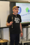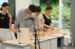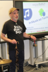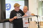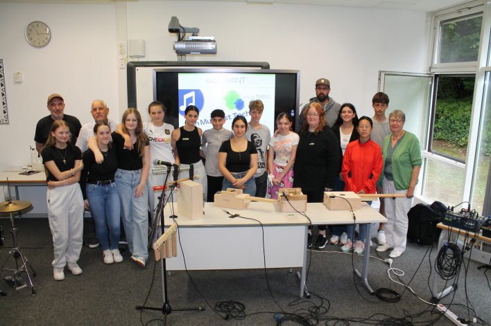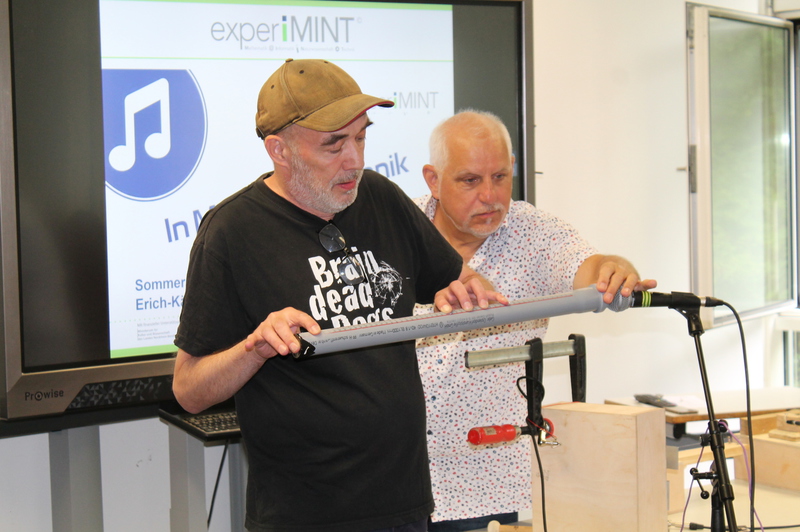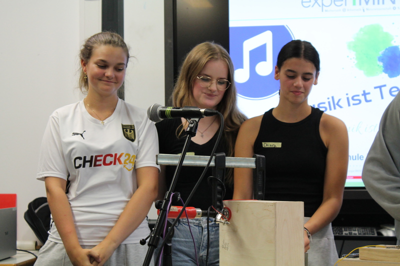 Imke Rademacher, eines der Gründungsmitglieder des Vereins experiMINT, stellte anschließend das anwesende experiMINT-Team, den Verein und den Ablauf des Projektes vor. Nachdem unterschiedliche Texte und Bilder einen guten Einblick in die Veranstaltung gegeben hatten, präsentierten die Schüler:innen gemeinsam mit dem experiMINT-Team ihr Können und spielten gemeinsam auf die am Freitag fertiggestellten Klangerzeuger. „Dies war eine Premiere – aus der Luft gegriffene Musik“, sagte Wienold nach der Vorstellung des Musikstückes. „Jedes Klangerzeugnis ist ein Prototyp. Es sind viele einzigartige Instrumente entstanden, mit denen wir heute das erste Mal gemeinsam musiziert haben.“ Im Anschluss präsentierte der Musikproduzent Joel Köhn die von den Schüler:innen erstellten Sounds. Unter anderem waren in den Tagen eine Klang-Collage entstanden (u.a. Grunzen eines Schweins, verschiedene Stimmen, Klopfen etc.) und ein sehr aufwändiges Stück, das aus 40 Tonspuren, die hauptsächlich aus dem von Köhn bereitgestellten Programm entnommen wurden, bestand.
