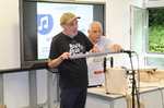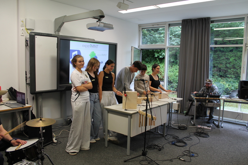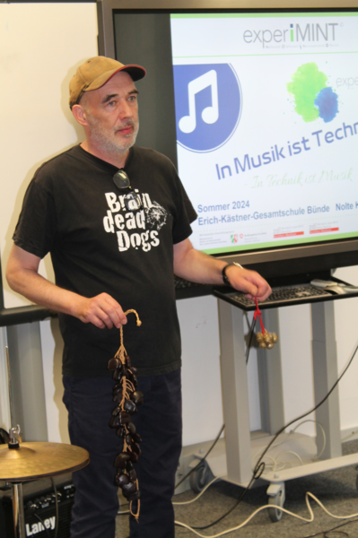 Eine Woche nach den Sommerferien, am 29.08. und 30.08.2024, besuchte das Team von experiMINT abermals die Räumlichkeiten der EKG Bünde. Gemeinsam mit den teilnehmenden Schüler:innen stellte es sowohl die Klangerzeuger als auch die Sounds fertig, so dass am Freitag (30.08.) die Ergebnisse vor einem ausgewählten Publikum präsentiert werden konnten. Der Musikpädagoge und Schlagzeuger Morten Wienold übernahm hierbei die Moderation. Er präsentierte dem Publikum zunächst verschiedenste Klänge – unter anderem durch ein großes Schneckenhaus, Kerne von einer Frucht, aber auch durch eine Glocke erzeugt. Wienold stellte die Frage, wie ein Klang entstehe, in den Fokus.