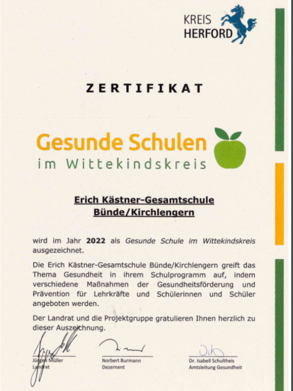 Eine besondere Auszeichnung erhielt die Erich Kästner-Gesamtschule Bünde am 15. September. Als eine von nur vier Schulen im Kreis Herford erhielt sie das Zertifikat "Gesunde Schule". Die besondere Auszeichnung erhält die EKG für ihren Einsatz in Suchtprävention, gesundem Frühstück, Gesundheitsförderung von Lehrkräften und Sexualpädagogik. Für weitere Informationen lesen auch auch den folgenden Zeitungsartikel.