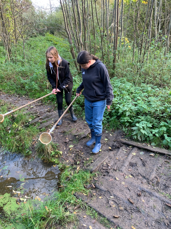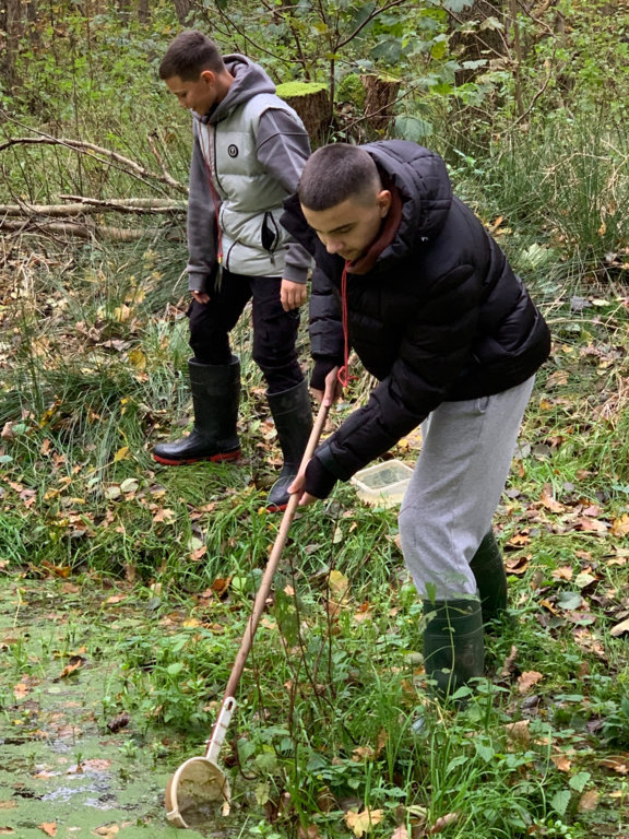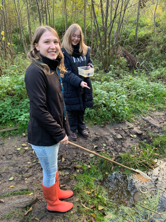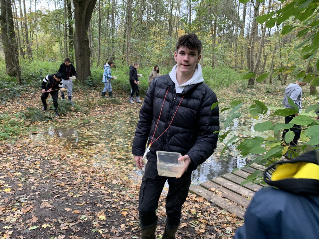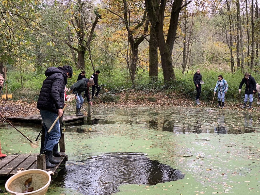 Die Schülerinnen und Schüler der 8g stehen an einem Teich des Biologiezentrums Gut Bustedt und schauen gespannt in das Gewässer. In ihren Händen halten sie Kescher, Pinzetten und Wassergefäße, um unterschiedliche Wasserorganismen aus dem Teich zu fischen.