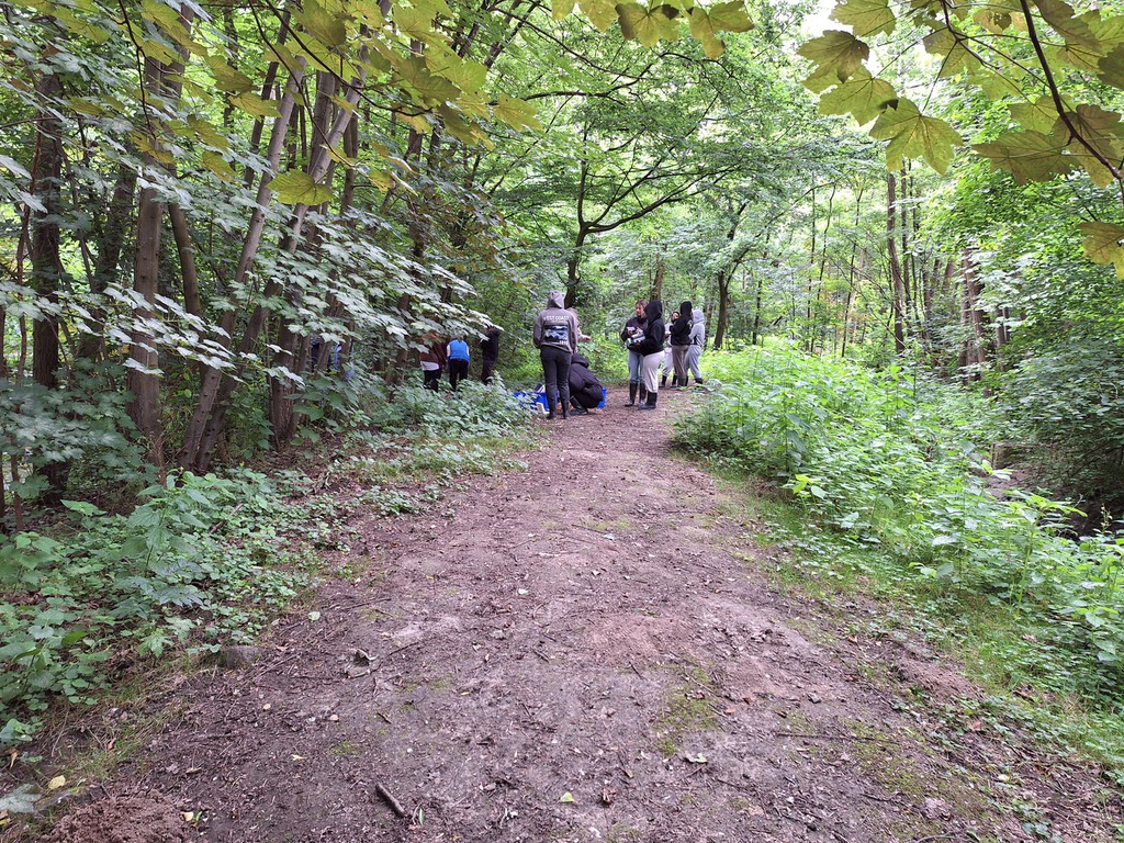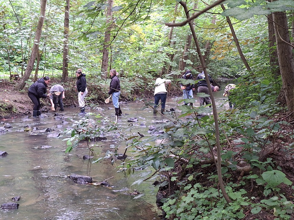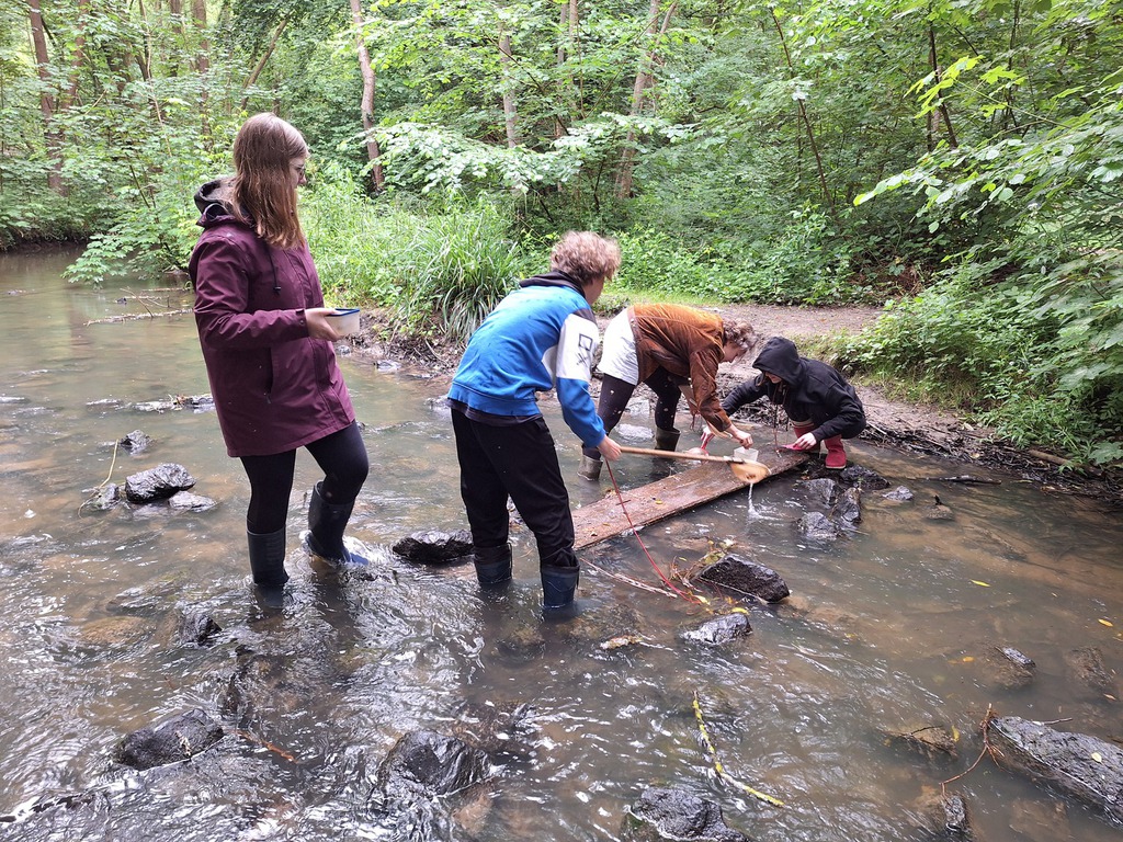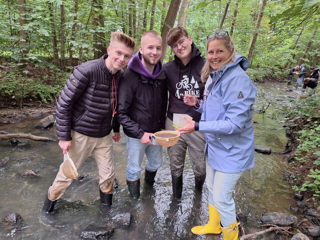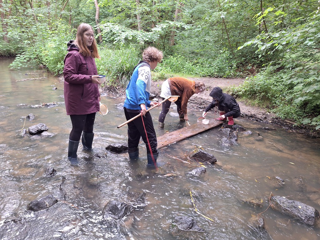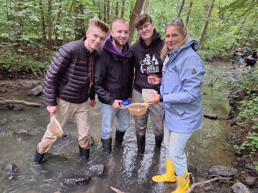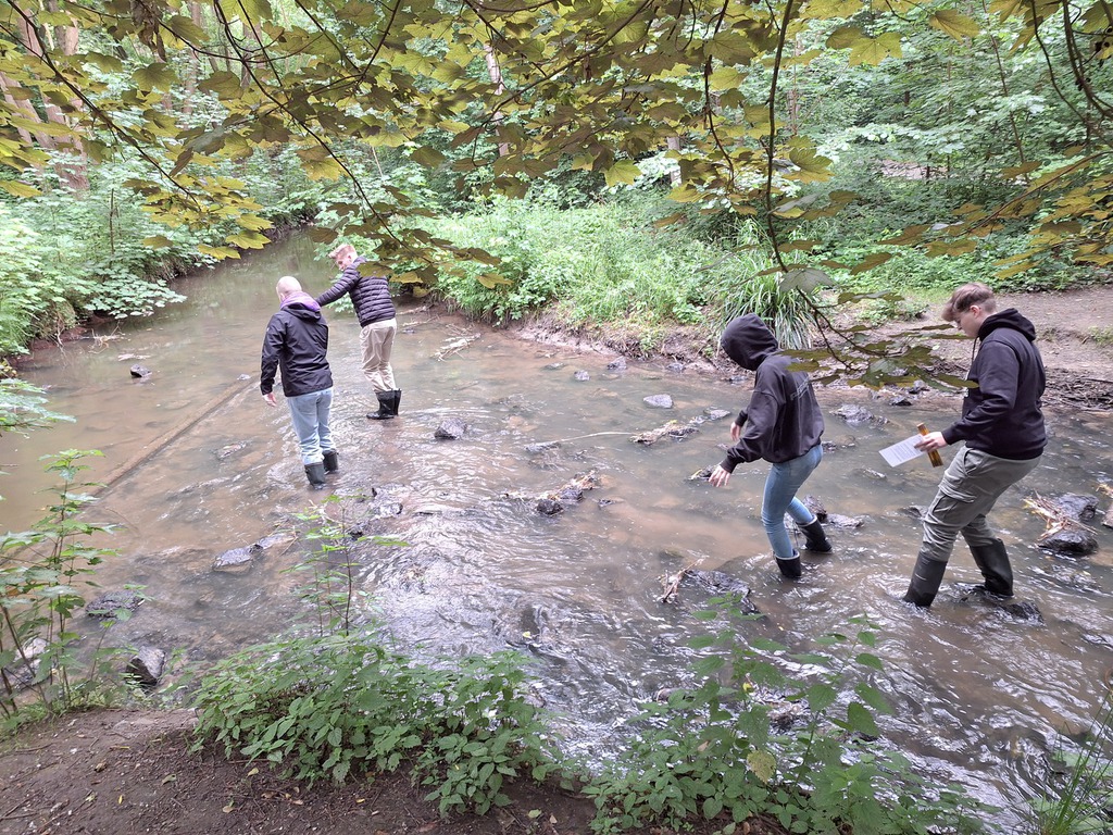 Zunächst erhielten die Schülerinnen und Schüler eine Einführung von der Biologin Frau Starrach, in der sie unter anderem den Tagesablauf vorstellte und eine umfangreiche Einführung in das Thema Fließgewässer gab. Frau Starrach stellte zu Beginn drei unterschiedliche Verfahren für die Gewässeranalyse vor, die sich gegenseitig ergänzen. Hierzu zählt die Untersuchung mit unseren Sinnen (Wie klar ist das Wasser? Wie warm/kalt ist es ungefähr? Wie riecht das Wasser?), die physikalische Untersuchung (u.a. Fließgeschwindigkeit/Strömung messen) und die chemische Untersuchung (unterschiedliche Parameter wie den Gehalt von Ammonium, Nitrat, Phosphat etc. messen). Nachdem die Biologin auf einzelne Faktoren noch einmal gezielt eingegangen war, steuerte die Gruppe einen Abschnitt des Brandbaches an, der sich hinter dem Biologiezentrum befindet. Dort führten die Schülerinnen und Schüler die unterschiedlichen Verfahren der Gewässeranalyse durch. Sie dokumentierten unter anderem die Trübung, Färbung, den Geruch und die Schaumbildung des Wassers. Auch die chemischen Werte (Sauerstoff, Ammonium, Nitrit etc.) wurden mit unterschiedlichen Messinstrumenten festgestellt. Zudem sammelten mit dem Kescher, durch das Unter-Steine-gucken und Im-Schlamm-buddeln verschiedenste Wasserlebewesen.