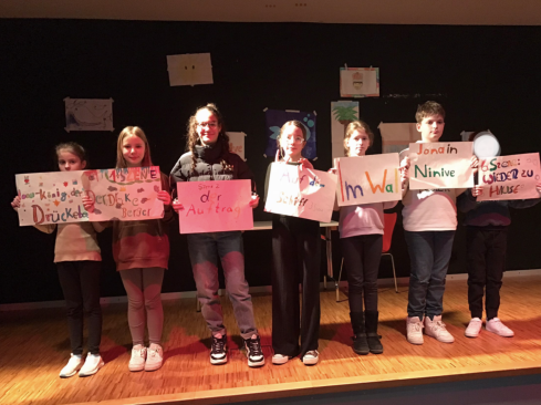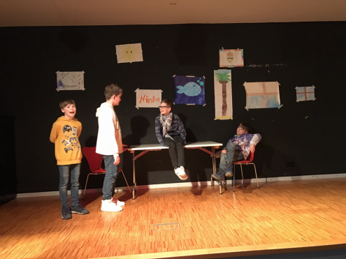 Wir haben in unserem Religionskurs das Thema „Jona und der Walfisch“ behandelt. Am Schluss haben wir dazu ein Rollenspiel in verteilten Rollen gelesen. Eine Klassenkameradin hat Frau Grannemann gefragt, ob wir das Stück auch aufführen können. Frau Grannemann war damit einverstanden. Und dann ging es los : wir verteilten die Rollen, malten Bilder für den Hintergrund und probten in der Kleinkunstbühne. Wir haben auch gemeinsam überlegt, wie wir die Bühne gestalten. Und dann war es soweit. Wir haben den anderen Religionskurs von Frau Burre eingeladen und ihnen das Stück vorgespielt. Uns, vom Religionskurs 5d/f , hat es viel Spaß gemacht. Und wir würden sehr gerne mal wieder ein Stück aufführen.