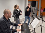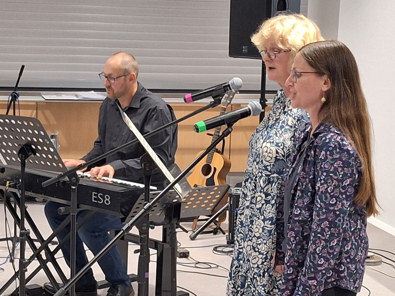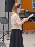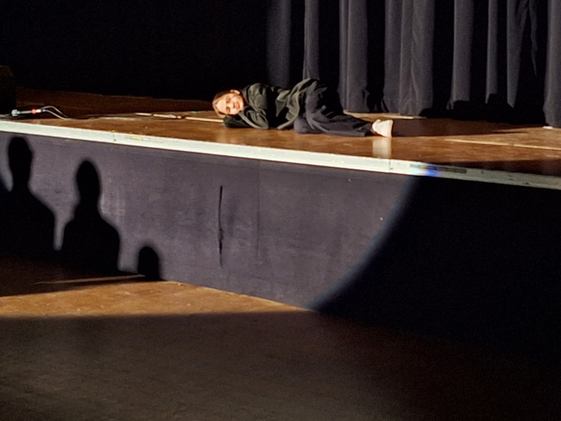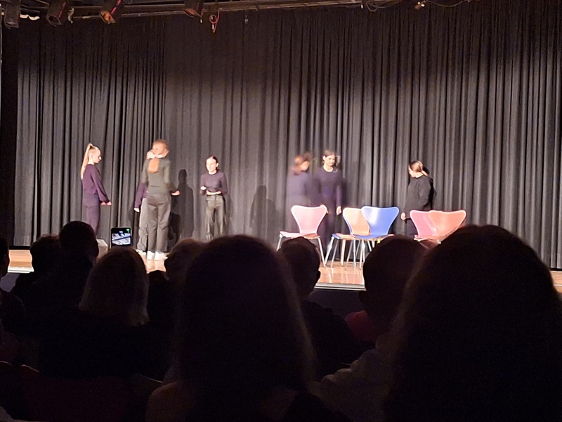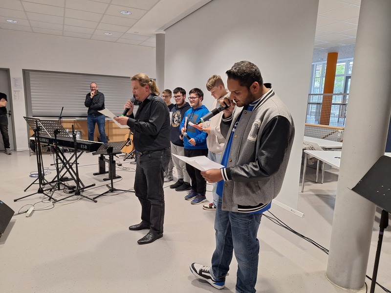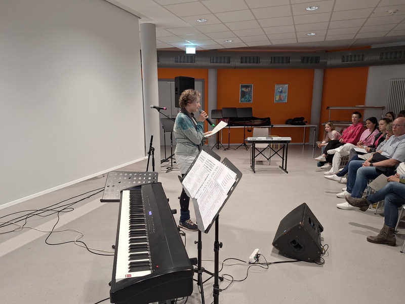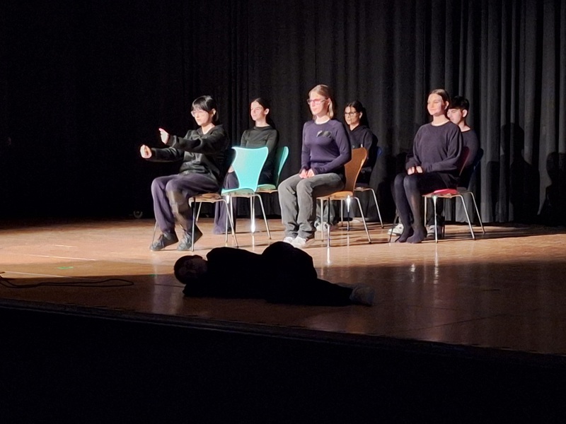 Unter der Leitung von Michael Helm präsentierten die Lesescouts aus dem zehnten Jahrgang und ein ehemaliger Schüler Texte von E. Jandl und R. Gernhardt, die zum Nachdenken anregten. Des Weiteren sang Luana Iapichino aus der 9f das Lied „Secrets“ von der französischen Sängerin Louane. Dieses Lied hatte sie bereits im Mai 2024 auf der Musikfahrt nach Voiron vorgeführt. Als nächster Programmpunkt stand das Stück „Spring Wind“ von E. H. Thiman an, welches von den drei Musiklehrer*innen Frau Festerling, Frau Rotzoll und Herrn Linnemann gesungen wurde. Mit nachdenklichen Worten zum 125. Geburtstag von Erich Kästner schlossen sich Frau Dittbrenner und Herr Fiedler an. Den Kontrast dazu präsentierte die ehemalige Schülerin Madlaine Sindermann mit dem Lied „Eine gute Nachricht“ von Danger Dan. Musikalisch ging es dann mit dem mehrstimmigen Sprechgesang „Fuge aus der Geographie“ von E. Toch weiter, was der EF-Musikkurs mit Frau Festerling unter der Leitung von Frau Rotzoll präsentierte. Frau Assmann und ihr EF-Kurs „Kreatives Schreiben“ stellten als vorletzten Programmpunkt selbstgeschriebene Texte zum Thema „Meine Nerven“ vor. Die Vortragenden schafften es geschickt, Humor und Nachdenkliches miteinander zu verknüpfen. Der Abend wurde durch eine Showeinlage von Lavinia Wessel aus der Q2, Herrn Klatt und Herrn Linnemann abgerundet.