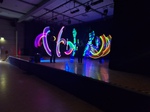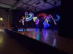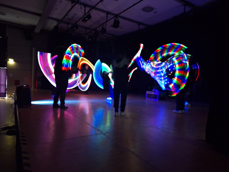 Der Abend startete im Forum der Schule. Die Darstellen und Gestalten-Kurse von Frau Meyer und Frau Strunk präsentierten eindrucksvoll die Themen „Reisevorbereitungen“ und „Am Flughafen“. Hierfür nutzten sie ihre ganze Körpersprache, um künstlerisch die bevorstehenden Sommerferien vor Augen zu führen. Die Poi-AG von Frau Wiemann schloss sich mit dem Lied „Wanna Dance“ an, um im Schwarzlicht ihr Können zu präsentieren.