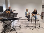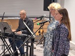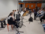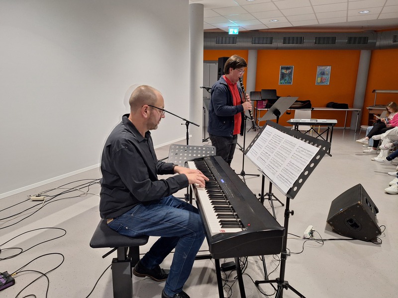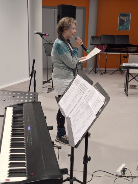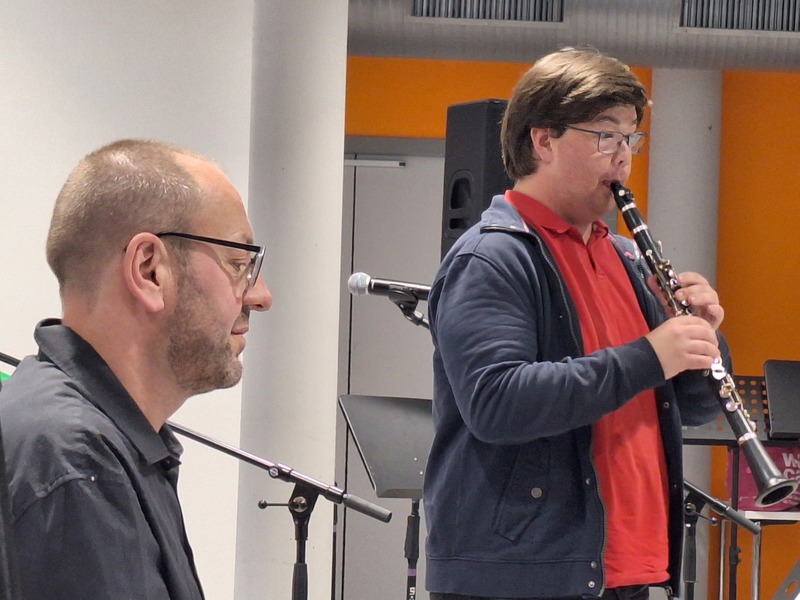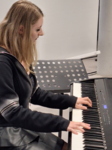 Die Mädchencombo der Klassen 5d und 5f präsentierte unter der Leitung von Frau Rotzoll das Lied „Fossilien“ (C. Saint-Saens). Weiter ging es mit der gesanglichen Einlage von Maria Burlacu aus der 10d, die „Slipping throug my fingers“ von ABBA präsentierte. Dem Gesang schloss sich ein selbst geschriebener Text von Nora Friesen aus der Q1 an, die humorvoll das Leben aus der Sicht eines Huhns beschrieb, das sich fragt, was denn „Hinterm Zaun“ los sei. Anschließend spielte die ehemalige Schülerin Melanie Fridritz das Lied „Kiss the rain“ von Yiruma auf dem E-Piano. Jule Bierbaum aus der Q2, Frau Neufert und Herr Linnemann brachten dem Publikum das Lied „Riptide“ (V. Joy) näher. Ein weiterer selbst geschriebener Text von Aileen Wichert aus der Q1 folgte. Sie nahm Bezug auf das menschliche Konsumverhalten und forderte dazu auf, zu handeln und die Augen zu öffnen. Tim Niederstadt aus der Q2 begeisterte im Anschluss auf seiner Klarinette mit dem Stück „A-Dur KV 622, 2. Satz“ (W. A. Mozart), wobei das Publikum das bisher Gesehene und Gehörte noch einmal auf sich wirken lassen konnte.