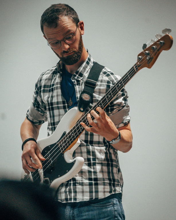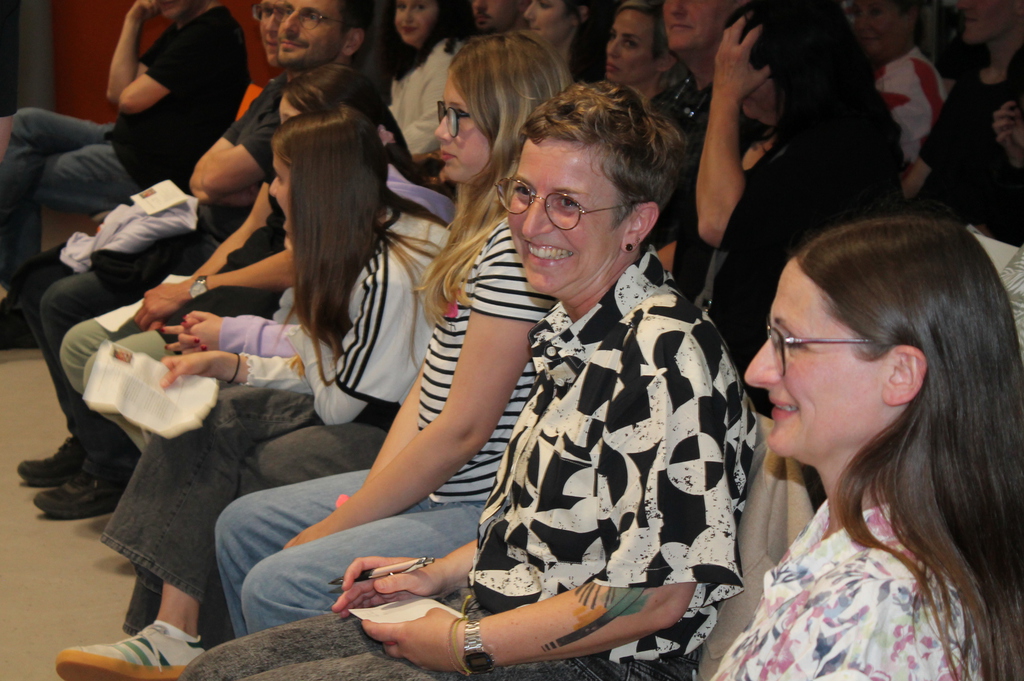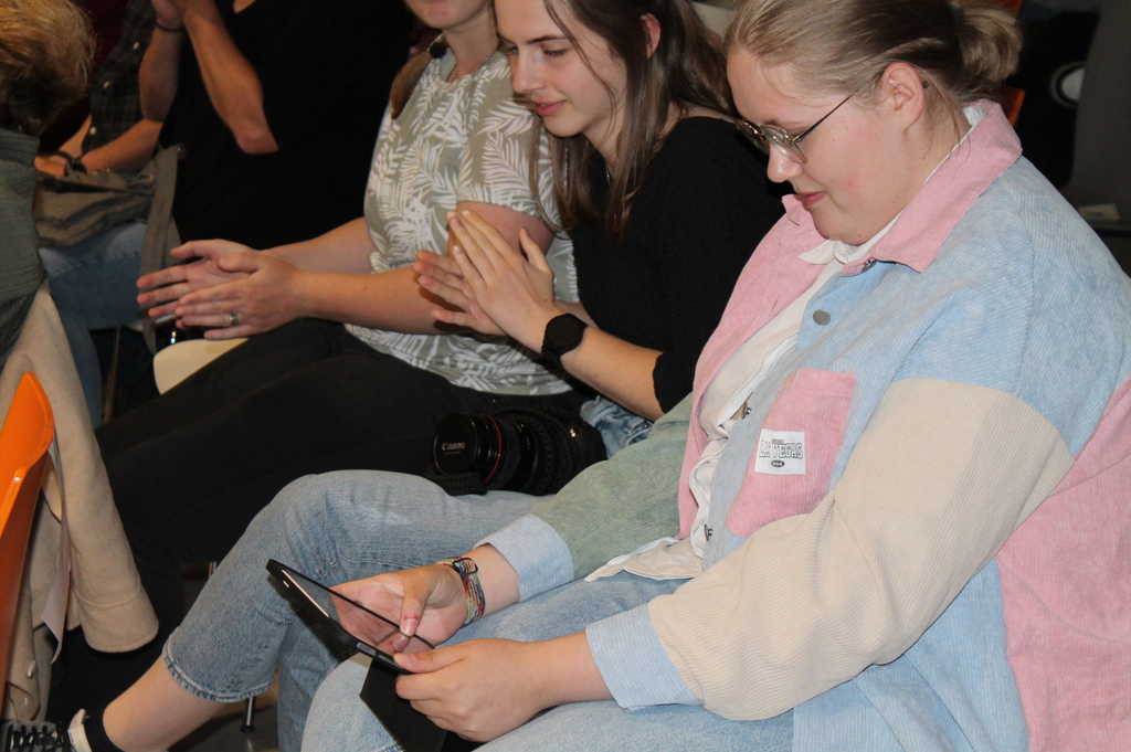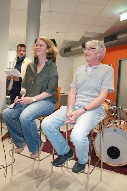 Für literarische Akzente sorgten die Lesescouts der Jahrgänge 9 und 10, geleitet von Michael Helm. Sie präsentierten ausgewählte Textausschnitte mit großer Ausdrucksstärke in dem unterhaltsamen Quizformat von „Wer weiß denn sowas?“, bei dem zwei Lehrer:innen-Teams gegeneinander antraten, um Titel und Autor der vorgelesenen Texte zu erraten. Für eine besondere musikalische Note sorgte der Musiklehrer Herr Bockholt, der mit seiner E-Gitarren-Version von „Suite Nr. 1“ (Johann Sebastian Bach) überraschte und begeisterte. Anschließend lasen Laura F. und Alea F. aus dem Projektkurs „Kreatives Schreiben“ (Q1) zwei eindrucksvolle Texte – beide reflektierten persönliche Erfahrungen und Gedanken junger Menschen auf berührende Weise. Vor der Pause präsentierte die ehemalige Schülerin Jule B. mit Gesang und ihrer Ukulele ihr Können. In der anschließenden Pause sorgte die Q2 für leckeres Fingerfood.
