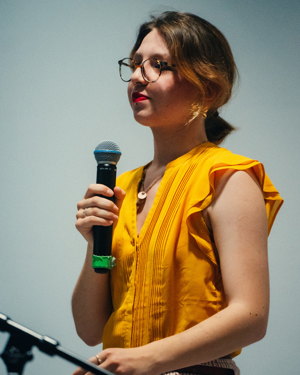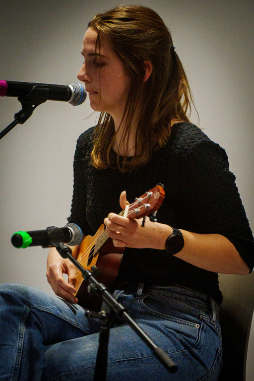 Im zweiten Teil des Abends spielte Katharina P. aus der EF ein gefühlvolles Klavierstück. Ihr Talent wurde bereits in der fünften Klasse entdeckt. Danach setzten die Lesescouts ihr literarisches Quiz fort. Ein weiter musikalischer Höhepunkt folgte mit Karen H. (EF), die ein eindrucksvolles Drums-Solo, welches sie improvisierte, darbot. Im Anschluss präsentierten Katharina P. (EF) und Lina R. (Q1) selbst verfasste Texte – wobei Lina das Publikum herausforderte, den Titel des Textes selbst zu erkennen.