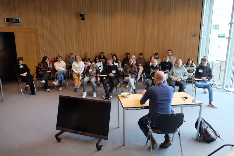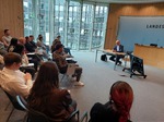 Nach einem gründlichen Sicherheitscheck startete das Informationsprogramm mit einem Vortrag über die Aufgaben und den Aufbau des Landtags sowie die Geschichte der Entstehung des Landes Nordrhein-Westfalens. Eigentlich sollte anschließend der Plenarsaal besichtigt werden, aber dieser war durch eine Fraktionssitzung blockiert. Stattdessen konnten die Schülerinnen und Schüler in der Landespressekonferenz selber eine Presseerklärung halten und sich den Fragen ihrer Mitschülerinnen und Mitschüler stellen. Nach einem späten Frühstück stand eine Diskussion mit dem Landtagsabgeordneten Christian Obrok aus Bünde auf dem Programm. In einer angeregten Diskussion stellten die Schülerinnen und Schüler Fragen zu den Themen, die ihnen unter den Nägeln brannten: Sicherheit und Umgang im Internet, Bildungspolitik, Rente, Tierschutz, Klimaschutz, Ausstattung der Feuerwehren. Auch wenn die Themen teilweise eigentlich nicht zur Landespolitik gehören, gab Obrok geduldig seine Meinung zu den einzelnen Themen kund. Ein Schwerpunkt des Gesprächs lag auch auf der Infrastruktur, insbesondere dem öffentlichen Nahverkehr in der Region Ostwestfalen. Dass es in diesem Bereich hakt, mussten die Schülerinnen und Schüler der EKG an diesem Tag am eigenen Leib erfahren: Auf der Hinfahrt verzögerte sich der Zug zwar nur um zwanzig Minuten, auf der Rückfahrt sorgten dafür gleich mehrere ausgefallene und verspätete Züge dafür, dass die Gruppe erst mit zwei Stunden Verspätung und einem Umstieg in den Bus nach Bünde zurückkehren konnten. Trotzdem war der Ausflug in den Landtag und die anschließende Erkundung der Landeshauptstadt Düsseldorf eine willkommene Alternative zum Schulalltag.